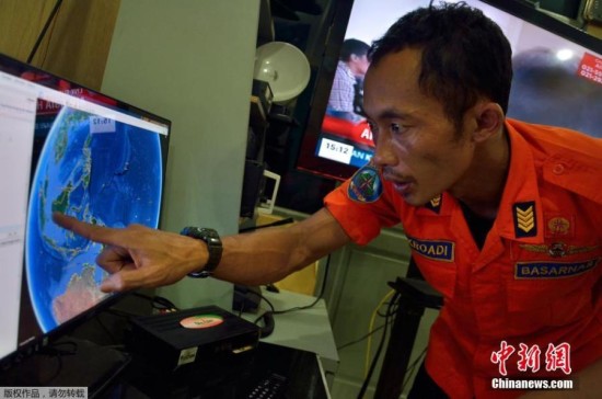 当地时间12月28日,印尼雅加达,印尼的国家搜索和救援机构官员在他的电脑屏幕上指出目前疑似亚航QZ8501坠落的海域。