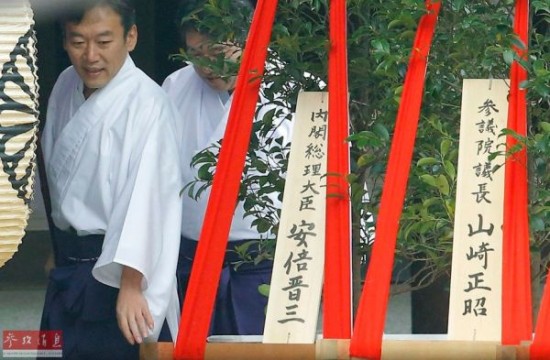 当地时间2014年4月21日,日本首相安倍晋三以“内阁总理大臣”名义向供奉有二战甲级战犯的靖国神社供奉称为“真榊”的祭品。