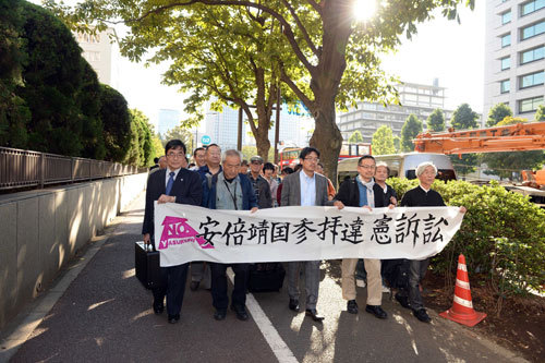 在日本东京地方法院外,部分日本民众举标语走向法庭,,状告日本首相安倍晋三去年12月参拜靖国神社违宪。