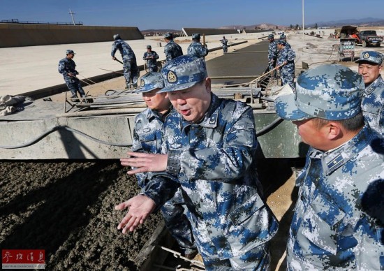 在红土高原某军用机场施工现场,空军第九工程总队总队长曹定国(中)亲临现场技术指导(2014年1月3日摄)。新华社发(刘应华 摄)