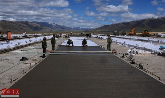 在雪域高原某军用机场扩建过程中,空军第九工程总队官兵克服高寒缺氧,日夜奋战,加班加点完成混凝土道面施工(2010年9月25日摄)。新华社发(刘应华 摄)