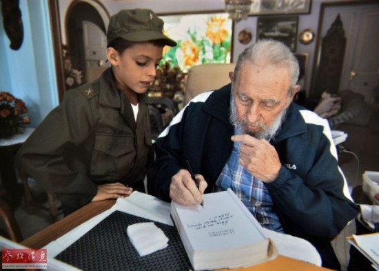 资料图片:古巴革命领袖菲德尔·卡斯特罗在家中会见8岁男孩马龙。