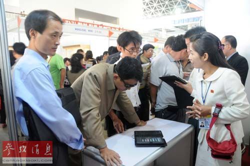 资料图:在平壤国际商品展览会上,人们参观由朝鲜电脑中心研发的平板电脑。新华社记者杜白羽摄