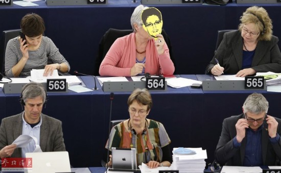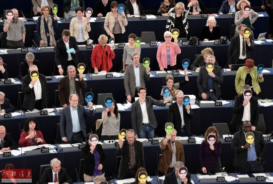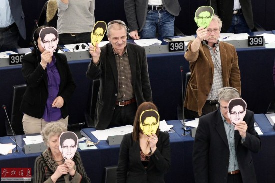 【延伸阅读】欧洲议会议员集体举斯诺登面具