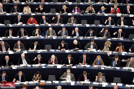 当地时间3月12日,在法国东部斯特拉斯堡举行的欧洲议会全体会议上,议员们在投票环节集体举起美国中情局泄密者爱德华·斯诺登的面具。