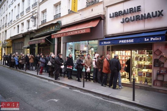 法国媒体报道称,上午天未亮许多书报摊就出现人龙,民众排长队等候购买最新一期《沙尔利周刊》,许多书报摊老板都说,从未看过未开市就出现人潮等着买这本杂志的,开卖后数分钟内就售罄。