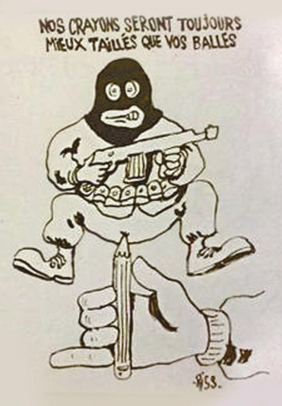恐怖分子的屁股被插上铅笔,漫画题为“我们的铅笔永远尖过你们的子弹”。
