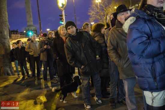 当地时间2015年1月14日,法国巴黎,民众正在排队等待购买最新一期的《沙尔利周刊》。