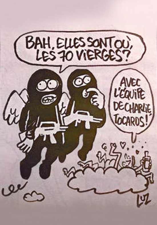 《沙尔利周刊》特刊部份漫画,两名枪手问:“嗯,70个处女在哪儿?”得到的回答是:“跟《沙尔利》团队在一起,失败者!”