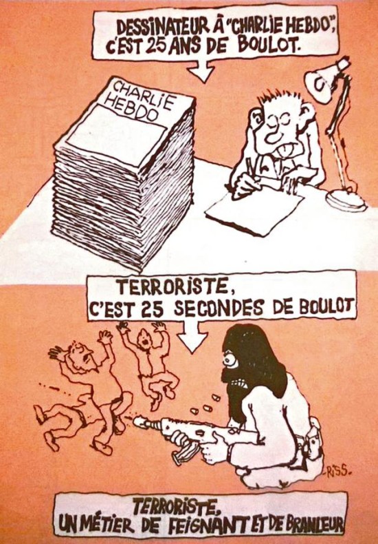 漫画指出《沙尔利周刊》的漫画家埋首工作25年,恐怖分子只做25秒工作,讽刺恐怖分子是懒鬼。