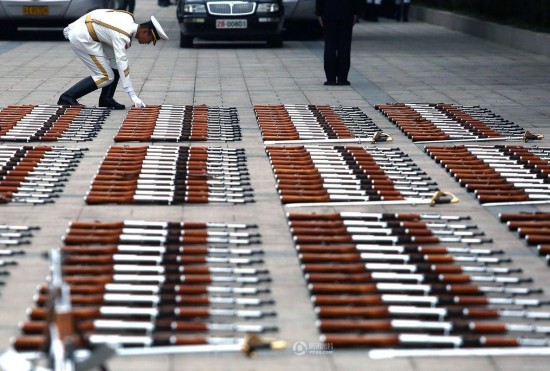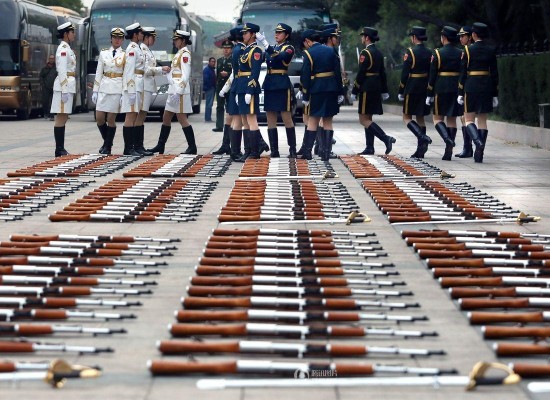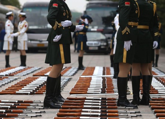 2014年10月28日,在北京人民大会堂东门外广场欢迎仪式上,仪仗队士兵训练,配枪整齐的码放在广场上。