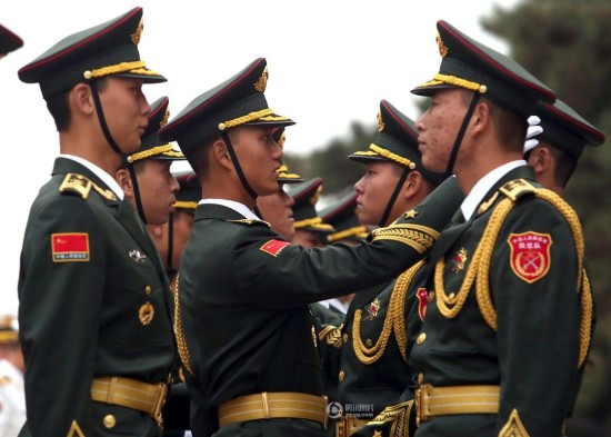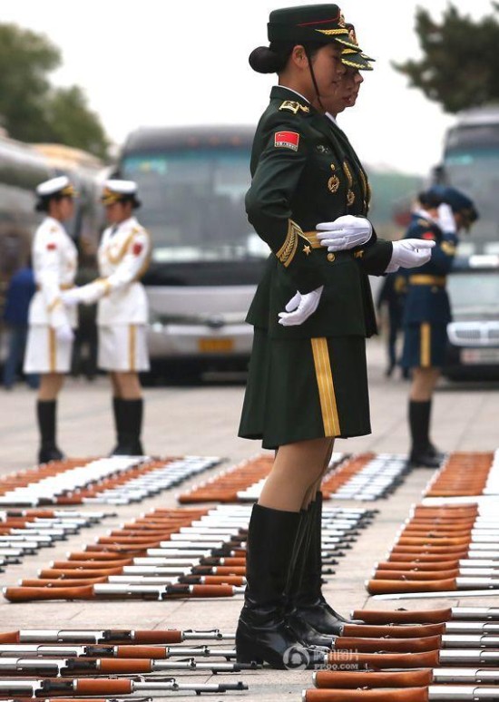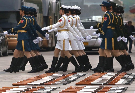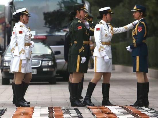 2014年10月28日,在北京人民大会堂东门外广场欢迎仪式上,解放军陆海空三军仪仗队伍中,女兵们正在进行训练。女仪仗队员的统一着礼服裙,因为穿裙子,马靴也进行了改进,款式比较契合腿型,而且还有5厘米的高跟。对于身高都超过1米7的女仪仗队员来说,很多人还是第一次穿高跟鞋。在发型要求上,女队员也有特殊的要求。在正式执行任务时,女队员统一在脑后挽起统一样式、统一大小的发髻。据介绍,仪仗队女兵们的发髻均由专业设计师设计,保持了女军人发型的简洁与端庄,展示了中国传统文化。