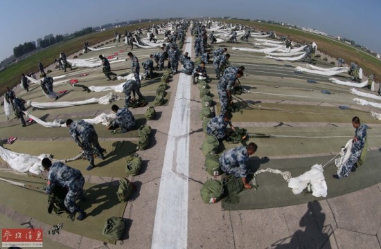 在空军某机场,千名新兵统一叠伞(5月11日摄)。新华社记者王建民摄