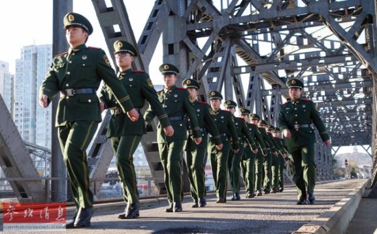 资料图片:一支士兵执勤班组在中朝友谊桥执勤。新华社记者 王建华摄