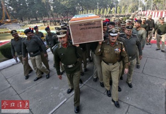 资料图片:印控克什米尔地区查谟的一处军营,印度边境保安部队为在阵亡战友举行葬礼。