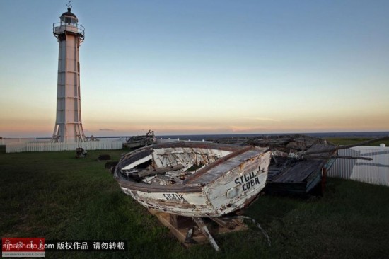 关塔那摩监狱(Guantanamo Bay detention camp)是美国军方于2002年时在古巴关塔那摩湾海军基地所设置的军事监狱,座落于古巴关塔那摩湾沿岸。最初的目的是临时关押拘留者,但美国军方逐渐将这个临时关押拘留者的场所改建成了一个长期使用的监狱。图为当地时间2014年11月4日,古巴关塔那摩湾,关塔那摩监狱内,一座灯塔和老旧的移民船只。