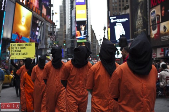 资料图片:参与者装扮成囚犯在纽约时报广场举行抗议,要求关闭美军在古巴关塔那摩监狱。