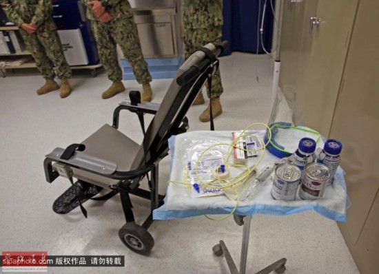 关塔那摩监狱当前关押着148名囚徒,一些人被关押了近13年,从未受到指控或审判,囚徒中“许多人”被视为美国的敌人。图为当地时间2014年11月4日,古巴关塔那摩湾,关塔那摩监狱内,为绝食抗议者用试管喂食的装置。