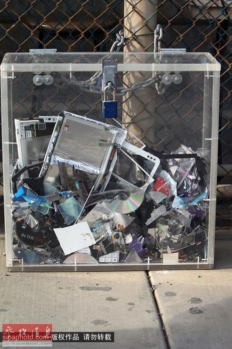 整个拘留营区是由D营、鬣鳞蜥营与X营等三个营区所组成,该单位经常被简称为Guantanamo或Gitmo(起源于该单位的缩写GTMO)。图为当地时间2014年11月4日,古巴关塔那摩湾,关塔那摩监狱内,在第5、第6区入口处放着一些手机、平板电脑、光碟等被禁止的电子设备碎片以示警告。