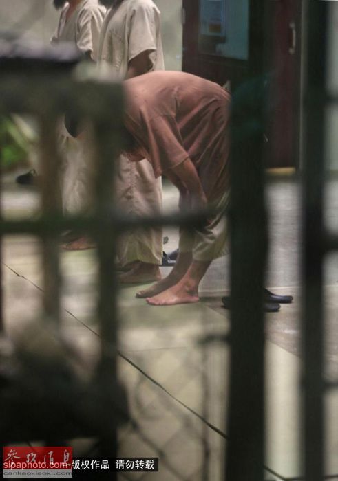 关塔那摩监狱(Guantanamo Bay detention camp)是美国军方于2002年时在古巴关塔那摩湾海军基地所设置的军事监狱,座落于古巴关塔那摩湾沿岸。最初的目的是临时关押拘留者,但美国军方逐渐将这个临时关押拘留者的场所改建成了一个长期使用的监狱。图为当地时间2014年11月4日,古巴关塔那摩湾,关塔那摩监狱内第6区,配合的俘虏正在进行下午的祈祷。