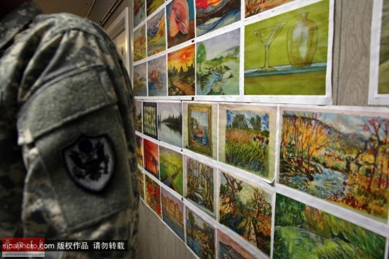 关塔那摩监狱(Guantanamo Bay detention camp)是美国军方于2002年时在古巴关塔那摩湾海军基地所设置的军事监狱,座落于古巴关塔那摩湾沿岸。最初的目的是临时关押拘留者,但美国军方逐渐将这个临时关押拘留者的场所改建成了一个长期使用的监狱。图为当地时间2014年11月4日,古巴关塔那摩湾,关塔那摩监狱内,在被关押者的图书馆内的绘画作品。