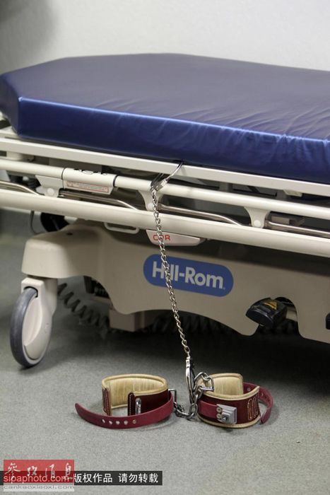 关塔那摩监狱当前关押着148名囚徒,一些人被关押了近13年,从未受到指控或审判,囚徒中“许多人”被视为美国的敌人。图为当地时间2014年11月4日,古巴关塔那摩湾,关塔那摩监狱内,医疗设备旁的手铐。