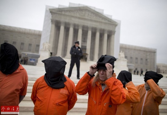 1月11日,在美国首都华盛顿的美国最高法院前,抗议者装扮成关塔那摩监狱囚犯的样子参加集会活动。新华社/美联