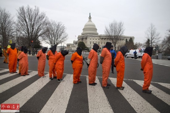 1月11日,美国关塔那摩监狱设立11周年,上百名抗议者在华盛顿举行集会,要求美国总统奥巴马实现承诺关闭该监狱。图为当日,在美国首都华盛顿的国会山前,抗议者装扮成关塔那摩监狱囚犯的样子参加集会活动。新华社/美联
