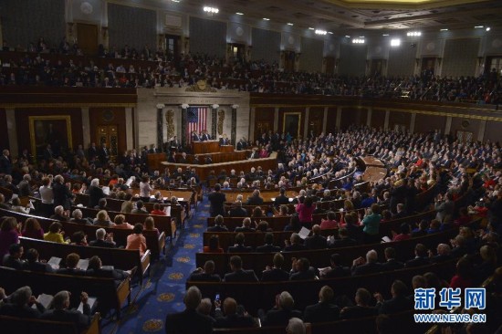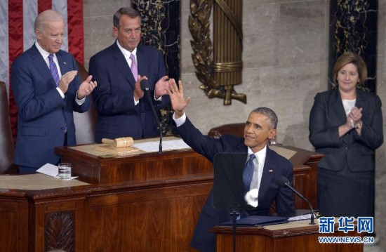 1月20日,美国总统奥巴马(后中)在华盛顿国会山发表国情咨文演说。美国总统奥巴马20日在国会发表国情咨文演说,强调未来会继续推行“中产阶级经济学”政策,以便使美国经济增长成果更好惠及美国中产阶级。新华社记者殷博古摄