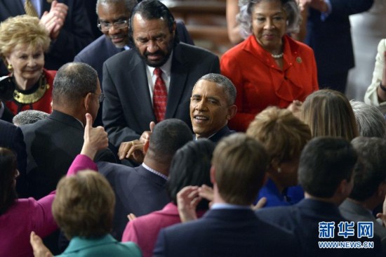 1月20日,美国总统奥巴马(中)抵达华盛顿国会山。美国总统奥巴马20日在国会发表国情咨文演说,强调未来会继续推行“中产阶级经济学”政策,以便使美国经济增长成果更好惠及美国中产阶级。新华社记者殷博古摄