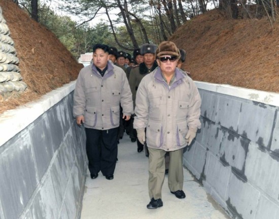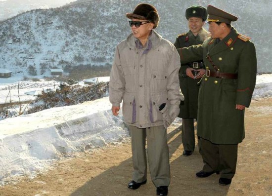 金正日生前和金正恩一同视察,两人身穿同款棉袄。