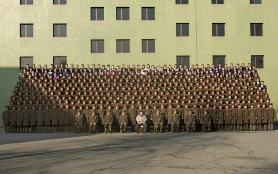 金正恩和后勤工作者合影,身穿棉袄与金正日同款。