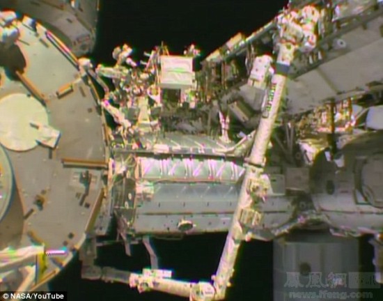 图为宇航员在修理国际空间站。