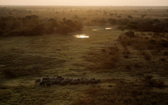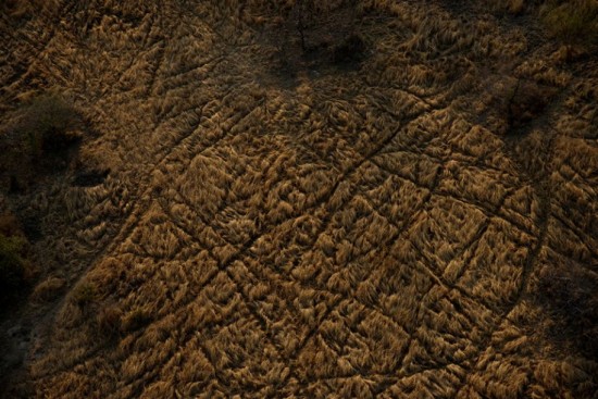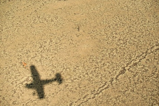 凯特从一架小型飞机上拍摄。在飞机阴影的上方,可以看到一只孤独的羚羊。