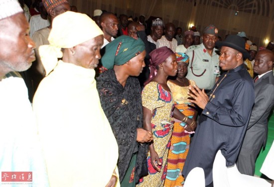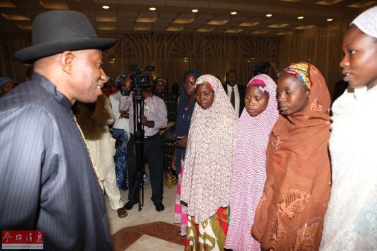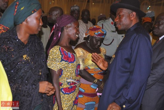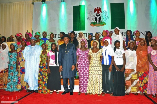 图为尼日利亚总统乔纳森与部分逃离“博科圣地”的被绑架女孩合影。