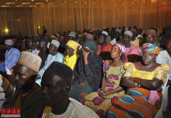 图为在现场的部分遭极端组织“博科圣地”绑架的女学生父母与同学。