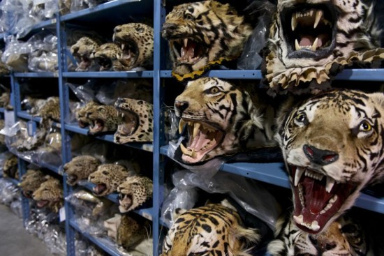 2013年,美国政府销毁了6吨重的象牙。美国鱼类与野生动物管理局同意凯特参观国家野生动物财产保管所,那里存放着大量缴获的非法盗猎动物制品。这排老虎头就存放于该保管所内。