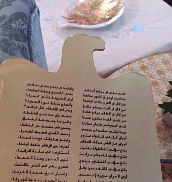 在这些照片中,班宁·侯赛因穿着一件传统的暗红色礼服,镶着银色的图案,看上去非常美艳动人。此外,照片还显示了班宁签署“结婚合约”的画面及婚礼的请帖样式。请帖是一只老鹰形状,曾是萨达姆当权时伊拉克国家的象征。