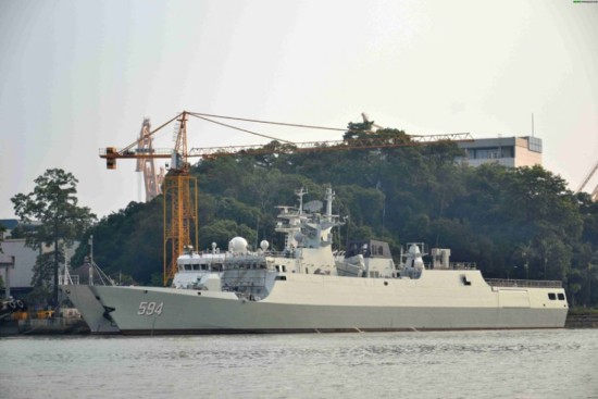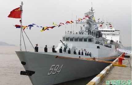 昨天(28日)上午,中国海军接连服役2艘新型056A护卫舰,分别是服役东海舰队的株洲舰舷号594,和服役南海舰队的潮州舰舷号595。图为中国海军594株洲舰。