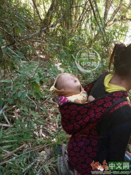 接下来的两个多小时内,司机们蹲在山林里,不敢大声说话,但他们并没看到缅军。饥饿的司机跑回公路想从车上拿食物,“刚到路边,一名缅籍翻译骑着摩托车过来,按着喇叭让我们快跑,说老缅兵来了”。图为逃亡路上被抱着的孩子。