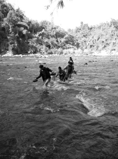 1月24日下午,多名伐木老板来到腾冲县政府递交《申请书》,希望政府帮助解救被缅甸政府军于1月3日前后在缅甸克钦邦龟头山、五台山木料场附近抓捕的155名伐木工人、767辆被扣车辆及工程机械,并称自己合法经营,所有人员及车辆都有合法出入境证件,并非非法伐木。图为送木材的中国司机赤脚蹚河躲避追捕。受访者供图 据缅甸中文网