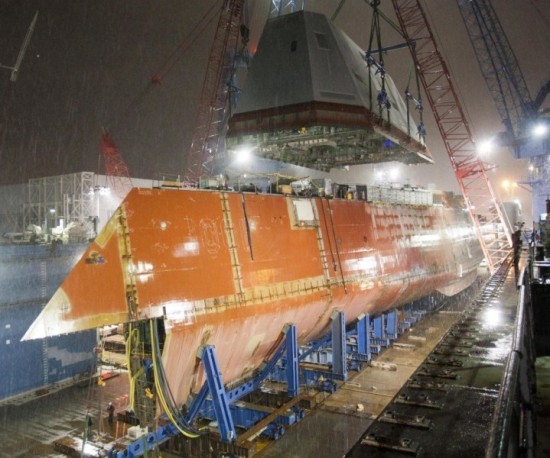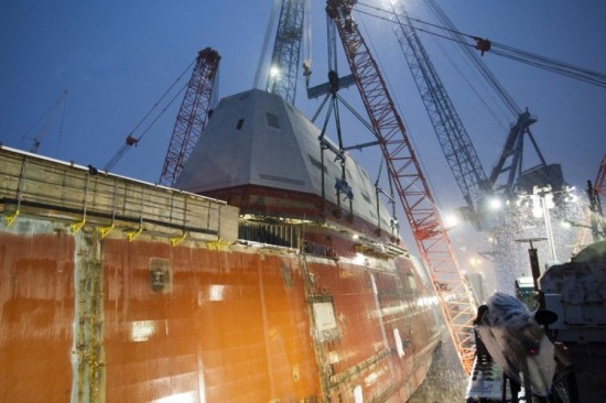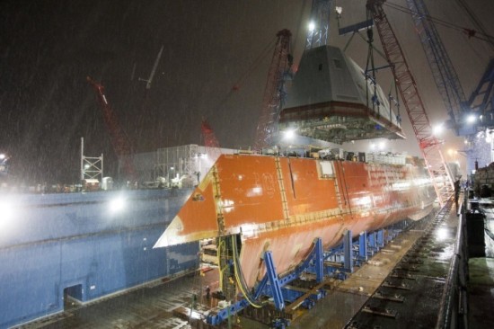 美国海军和工业届已经签订了建造首批两艘DDG-1000的合同。两艘新舰代表了海军作战的转型的开始。首批两艘舰艇将分别在巴斯钢铁公司(通用动力公司下属公司)和英格尔斯公司(诺斯罗普·格鲁曼公司)建造。图为美国巴斯钢铁造船厂内,第二艘造型科幻的DDG-1000型驱逐舰麦克-蒙苏尔号正在进行舰桥吊装作业,这是即将安装到位的舰桥。