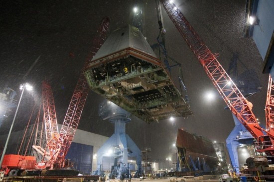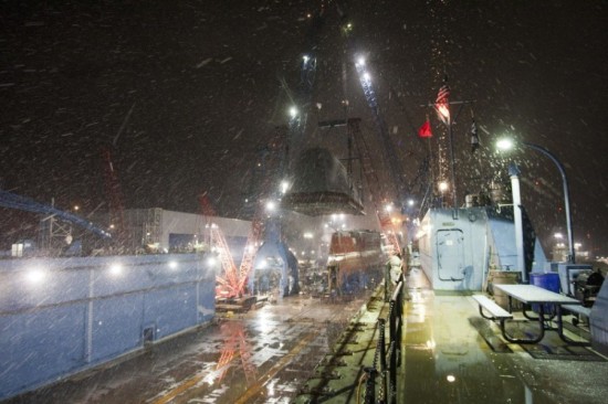 【延伸阅读】美军最新科幻战舰在风雪中安装舰桥