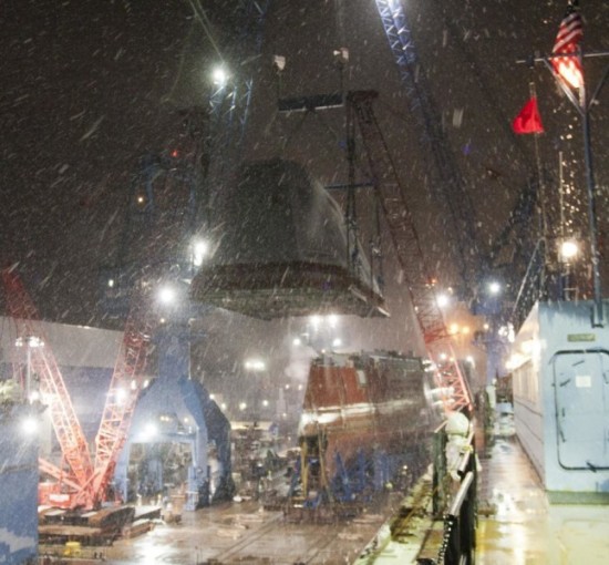 11月13至14日,美国巴斯钢铁造船厂内,第二艘造型科幻的DDG-1000型驱逐舰麦克-蒙苏尔号正在进行舰桥吊装作业。吊装作业在雪夜中进行,让人感觉科幻味道十足。按计划,DDG-1001蒙苏尔号2016年服役,首舰DDG-1000将于明年服役。图为DDG-1001在风雪中安装上层建筑。