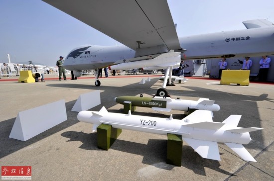 2012年11月13日,第九届中国国际航空航天博览会在广东省珠海市开幕。备受关注的我国无人机制造领域“当家明星”——“翼龙”无人机系统实物亮相。该款无人机装有一台100马力活塞发动机,具备全自主平轮式起降和飞行能力,最大起飞重量达1100公斤,最大续航时间为20个小时,可携带各种侦察、激光照射/测距、电子对抗设备及小型空地打击武器,可执行监视、侦查及对地攻击等任务,也可用于维稳、反恐、边界巡逻等。新华社记者 梁旭 摄