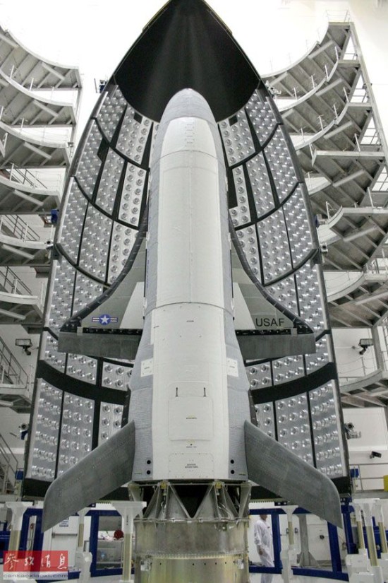 美国空军2012年9月27日公布的照片显示,美国空军的无人驾驶且可重复使用的航空器X-37B空天战斗机在美国佛罗里达州泰特斯维尔航空实验场进入发射位置。X-37B空天战斗机既能在地球轨道飞行,又能进入大气层,结束任务后还能自动返回地面,被认为是未来太空战斗机的雏形。新华社/法新