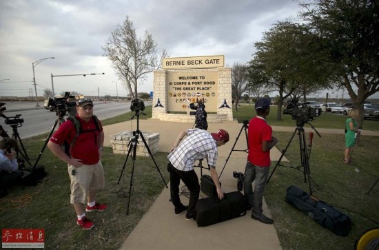 4月2日,美国得克萨斯州中部,媒体记者聚集在胡德堡军事基地外,等待官方说明。