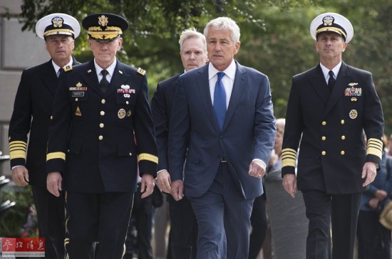 当地时间9月17日,美国国防部长哈格尔率领军方将领,向海军大楼枪击案遇难者敬献花圈。