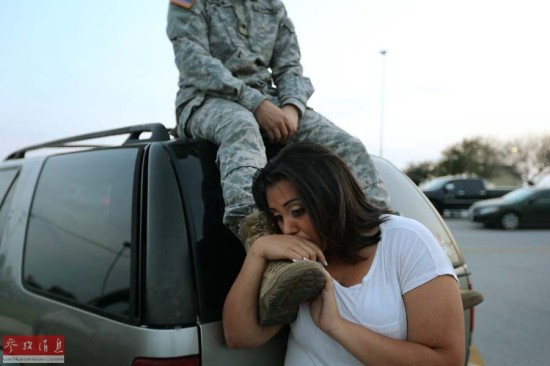 4月2日,一对夫妇等待回到胡德堡军事基地的家中。