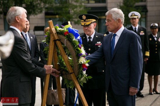 这是美国国防部长哈格尔率领军方将领向海军大楼枪击案遇难者敬献的花圈。